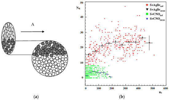 The NIKFI BR-2 emulsion contains heavy silver and bromine (AgBr) nuclei (25.5%), light hydrogen nuclei (39.2%), and carbon, nitrogen, and oxygen (CNO) nuclei (35.3%). Therefore, it is necessary to separate events that occurred with different targets. For this purpose, the dependence of the number of fragments from the target nucleus, Nh, on the multiplicity of s-particles, ns, is often used (Figure 1b). The separation of events with heavy targets was carried out according to the criterion Nh > 8, as the heaviest nucleus among the light nuclei of the emulsion, oxygen, has a charge of 8.