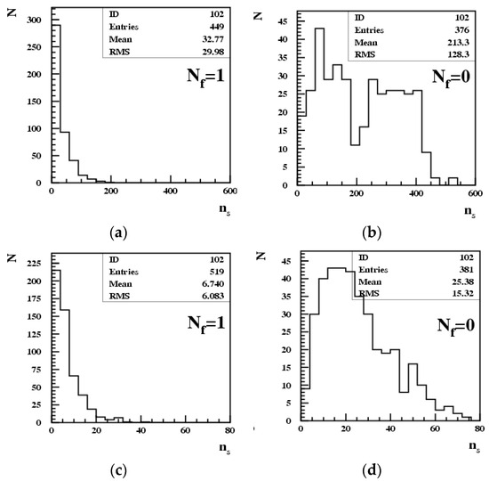From Figure 2a, it can be seen that, as expected, the probability of the occurrence of high-multiplicity events with Nf = 1 is significantly less than the probability of low-multiplicity events. At the same time, for events with Nf = 0, an unexpected result was obtained, presented in Figure 2b.