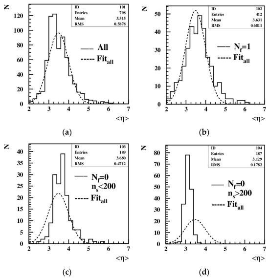 For comparison, in Figure 3a–d, a fit with a Gaussian function is superimposed for the complete distribution over the average pseudo-rapidity of s-particles, normalized to the number of events. As it can be seen from Figure 3d, the distribution of the average pseudo-rapidity of s-particles in events with Nf = 0 and a multiplicity ns ≥ 200 differs significantly from other distributions presented in this figure.