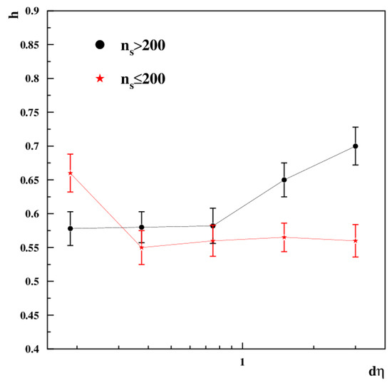 A detailed analysis of each individual event showed that the behavior of the Hurst exponent for events with Nf = 0 and a multiplicity of ns ≥ 200 in S+Em at 200 A·GeV interactions differs significantly from the behavior of the Hurst exponent for events with Nf = 0 and a multiplicity of ns < 200. The results are presented in Figure 4.