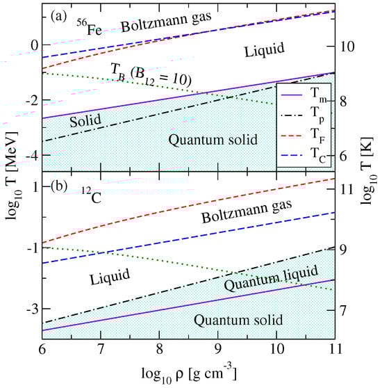 The general structure of the phase diagram is similar for and carbon nulcei. However, an important difference appears in the low-temperature regime: while the plasma temperature is always smaller than the melting temperature in the case of , in the case of instead, the quantum effects become important before the solidification sets in. In addition, the phase diagrams for these elements do not take into account that at high temperatures and/or densities, the energy and pressure are sufficient to overcome the Coulomb barrier, allowing nuclei to fuse almost instantaneously. This fusion process occurs more rapidly than the rates at which the plasma can maintain its low-Z composition. As a result, rather than remaining in a stable plasma state, the particles in the plasma will quickly undergo fusion reactions, leading to the formation of heavier elements. Consequently, the existence of a low-Z plasma becomes untenable in such environments.