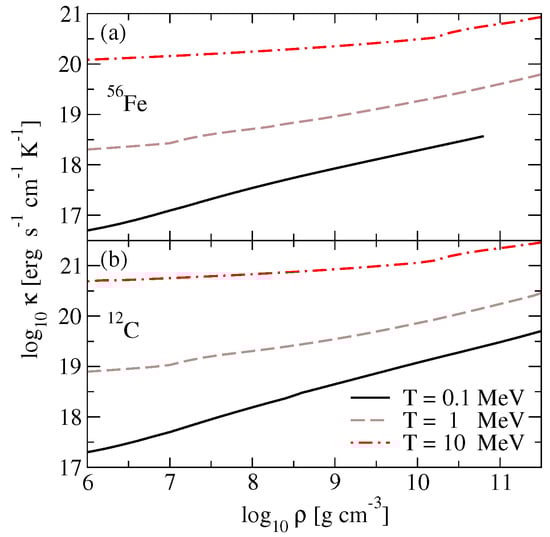 We start the discussion of our numerical results with the density, temperature, and composition dependence of the longitudinal thermal conductivity . Figure 3 shows the thermal conductivity as a function of density for various temperatures for the crustal matter consisting of and nuclei. The chosen values of the temperature cover both the non-degenerate ( MeV) and the degenerate ( MeV) regimes for electrons with the value MeV being representative for transition between these two regimes (the transition density is around log10 g cm3 for both types of nuclei, see Figure 1). The thermal conductivity shows a power-law increase in density with and in the degenerate regime, and (for both nuclei) in the non-degenerate regime. This behavior is similar to the density-dependence of the electrical conductivity, which is a consequence of different density and temperature dependence of the relaxation time in these regimes (see Ref. [13] for details).