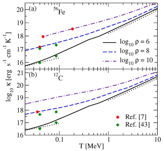 For the sake of comparison, we show in Figure 4 the low-temperature results of Ref. [7], which are in very good agreement with ours. Note that both computations take into account the electron–ion collisions but neglect the electron–electron ones. They also use fits to the same data for the static structure factor . However, they treat the screening effects encoded in the electron polarization tensor differently: Ref. [7] uses the highly degenerate limit of the random-phase-approximation of the polarization tensor including vertex corrections in the static limit; our study utilizes the hard-thermal-loop approximation to the dynamical polarization tensor (see Ref. [13] and references therein). We also show the results extracted from the table provided by Ref. [43] for K and K, the largest value for temperature available. Our values of are larger by about 30–40% for and 50–75% for compared to this work. The main difference is that Ref. [43] includes electron–electron collisions in addition to electron–ion collisions. The structure factor used in this work differs from ours: it utilizes the fits of Ref. [37] to hypernetted chain computations for one-component plasma, whereas we use data based on older Monte Carlo simulations of liquid structure function for the same system [38,39,40]. Similarly to the previous case, the treatments of the electron polarization tensor are not identical in terms of approximation and inclusion of dynamical effects.