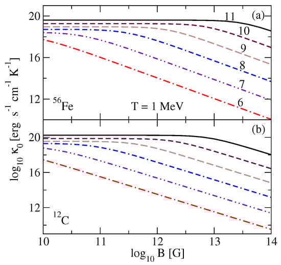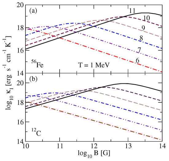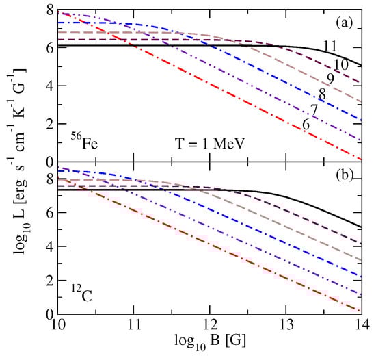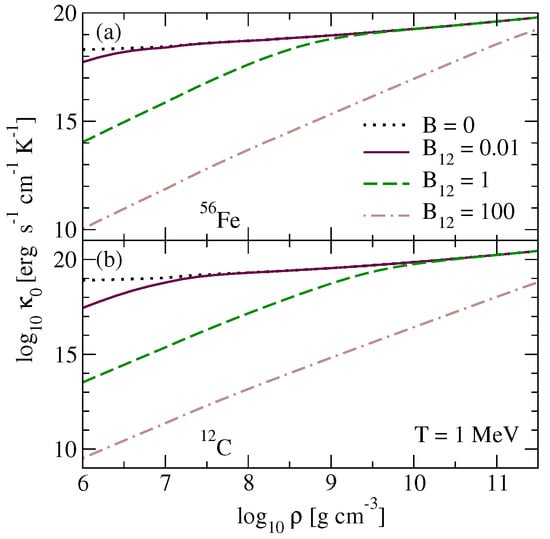 At low densities and/or large magnetic fields , and increases linearly with the density and temperature, but does not depend on the type of nuclei. At high densities, decreases slowly with the density, as implied by Equation (43) (see Figure 6). At the point where , the transition between these two regimes occurs, and displays a maximum there.