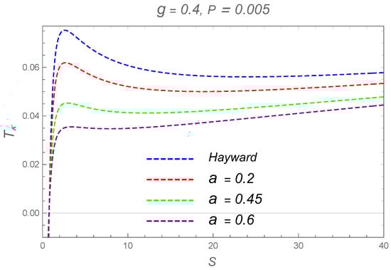 As depicted in Figure 2 and Figure 3, the temperature exhibits a varying pattern with the entropy S, and displays local maxima and minima. This behavior confirms the occurrence of phase transitions between different stages of BHs. The temperature reaches zero at a specific entropy value, revealing an extremal BH. The extremal BH’s entropy allows us to determine its corresponding radius, which can also be calculated from the metric function. The extremal BH radius corresponds to where the metric function reaches its minimum, signifying that the derivative of the metric function at that point is zero. The temperature expressions for the Hayward–AdS and Schwarzschild–Letelier–AdS BHs, respectively, are as shown in the figures.