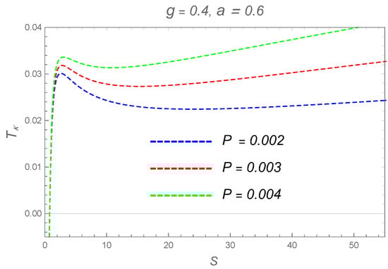 Graphical representation depicting the temperature associated with the Hayward–Schwarzschild–Letelier–AdS solution (21) for varying values of P.