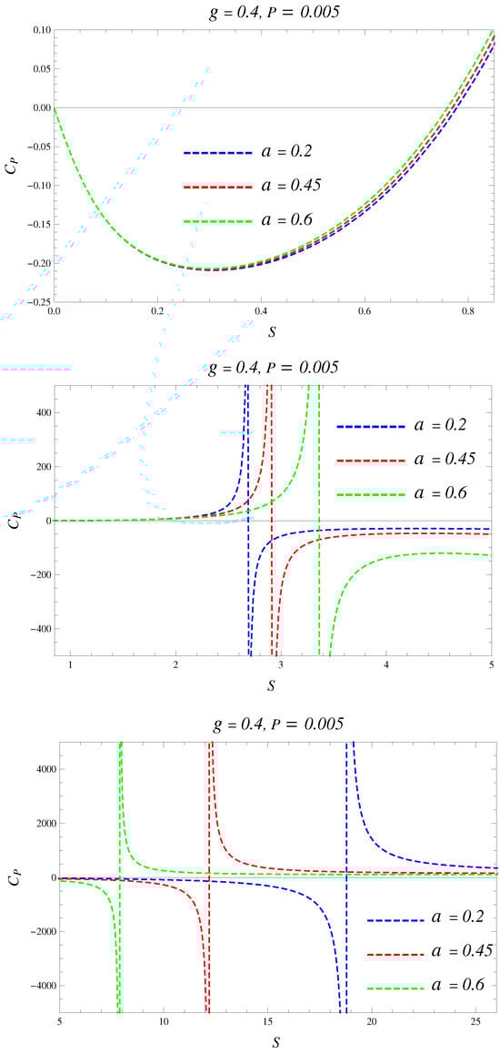 Graphical representation of heat capacity at constant pressure corresponding to the Hayward–Schwarzschild–Letelier–AdS solution (19) by considering , , and varying values of a and S from left to right.