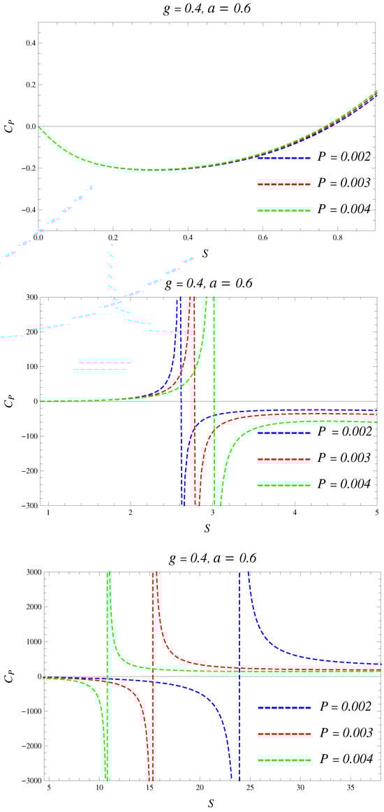Graphical representation of Heat capacity at constant pressure associated with the Hayward-Schwarzschild–Letelier–AdS solution (19) with , , and varying values of P and S from left to right.