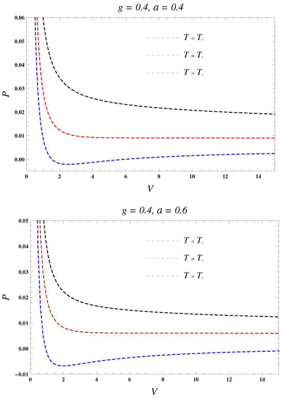 In Figure 6, we depict the isotherm on the diagram, corresponding to three different cases, , , and , where is the critical temperature to find the for , our system behaves like an ideal gas as the pressure monotonically decreases with increasing volume. Conversely, for , the system shows oscillating behavior, signifying the van der Waals-like phase transition between small (high pressure) and large (low pressure) BHs.
