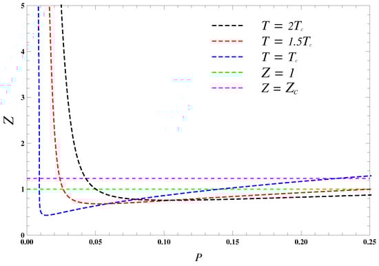Figure 7 shows the behavior of Z against pressure for different values of temperature. The compressibility factor for our system shows a divergence for small values of pressure. It then decreases as we increase the pressure to reach minima, and then it starts increasing again as we further increase the pressure. We can easily see the deviation of the compressibility factor of our system from the ideal gas for which . We also calculate the compressibility factor at the critical point, which is , which is more than thrice that of a van der Waals fluid ( [72]).