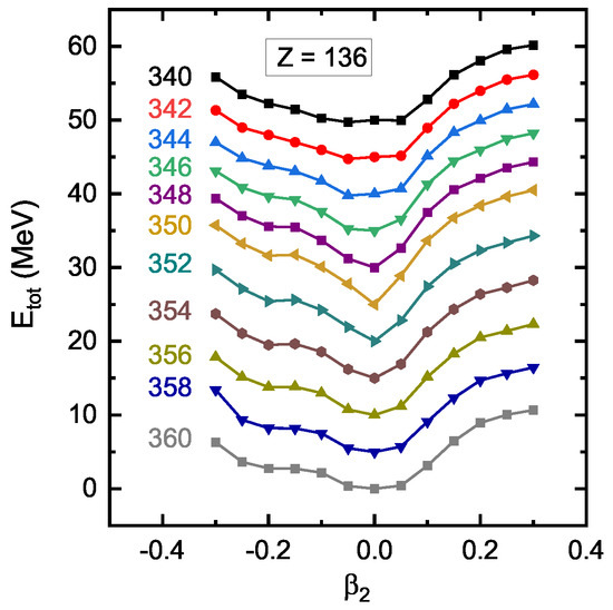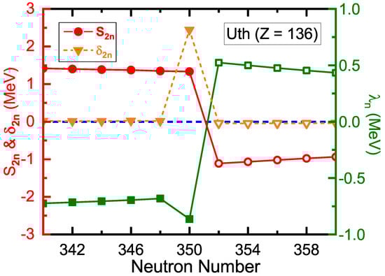 In Equation (4), the pairing strength MeV , the saturation density , and a pairing window of 100 MeV are adopted. The energy cutoff = 300 MeV and the angular momentum cutoff = 23/2 are adopted for the Dirac Woods-Saxon basis. In Equation (5), the Legendre expansion is truncated at []. The calculations are carried out with the relativistic density functional PC-PK1 []. These numerical details are the same as the calculations of nuclei with in the global DRHBc mass table calculations over the nuclear chart [,,], and have also been examined to be proper for the studies in this work.