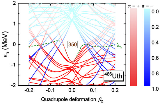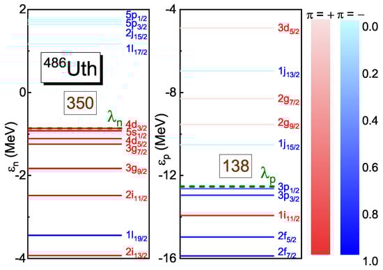 Figure 4 provides single-neutron and single-proton levels around the Fermi levels for the spherical ground state of 486Uth, and the corresponding spherical quantum numbers are labeled. As can be seen, the big gap of appears between the level and . In the future works, it would be interesting to check the model dependence of neutron magic number , as well as the related levels, among different methods and different functionals employed.