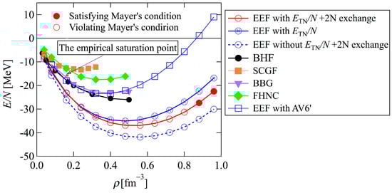 Figure 1 shows the energy per nucleon of SNM with the Argonne v8’ potential as a function of . The result with the EEF given in Equation (22) is indicated by red circles. We note that the calculated saturation point deviated from the empirical saturation point [26] because the higher-order components in the two-body nuclear force and the three-body nuclear force were not considered in the current calculations.