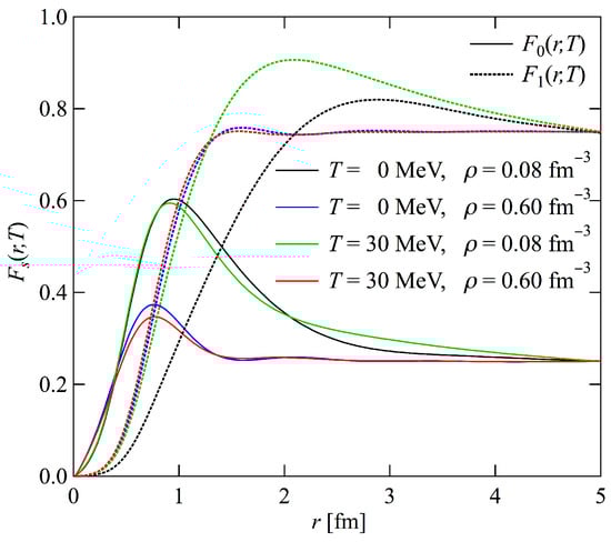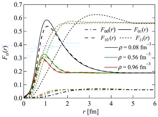 The spin-isospin-dependent radial distribution functions, , are shown in Figure 2 for = 0.08, 0.56, and , respectively. The values are close to zero at small values of r, owing to the repulsive core of the nuclear potential. As r increases, the even-state distribution functions and have peaks near 1 fm caused by the attraction of the even-state nuclear force, contrary to the case of the odd-state functions and , where the attraction is weak.