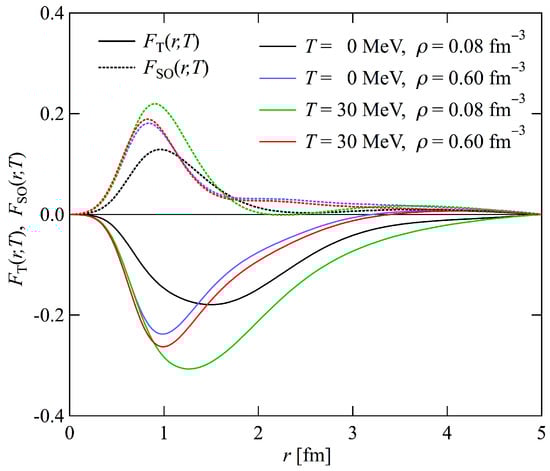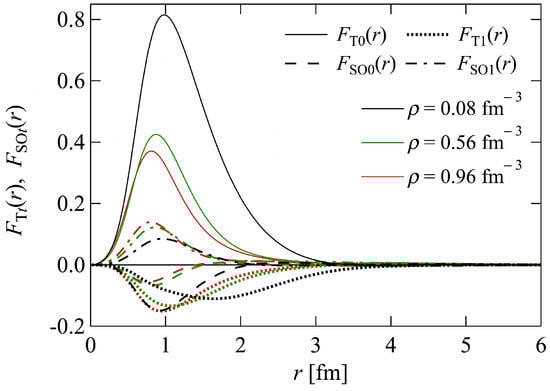 The tensor distribution functions and the spin-orbit distribution functions are shown in Figure 3 at = 0.08, 0.56, and 0.96 . The signs of and are opposite to each other and are determined by the relative phase between and . The extremely large peak of can also be observed near 1 fm at , which is caused by the violation of the Mayer condition (i.e., the formation of deuteron clusters at low densities).
