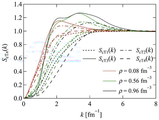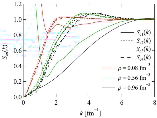 Figure 4 shows the structure functions at various densities. As mentioned previously, the Mayer condition is violated at relatively low densities. Conversely, as the density increases, approaches zero, thereby satisfying the Mayer condition. In contrast to , with converge to zero as k approaches zero. Additionally, at a given density , the differences between with are not remarkable.