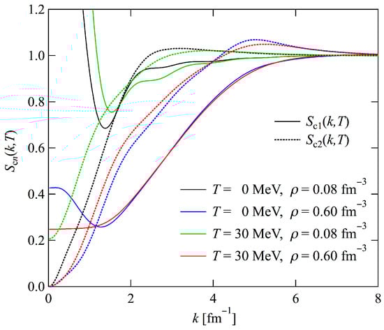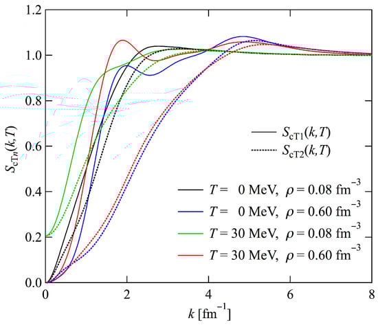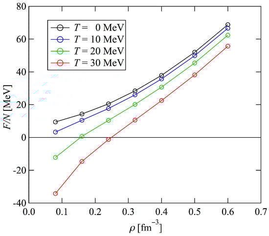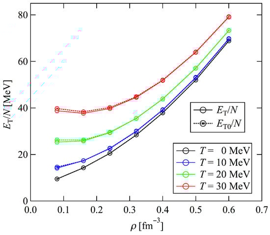 In other words, we start with the EEF of PNM at zero temperature, which is expressed by , , and or, more precisely, the auxiliary functions , , and . Furthermore, the EEF includes and , which correspond to and for SNM given by Equations (9) and (10), respectively. Because and correspond to the following neutron occupation probability , we replace with , given by Equation (37), to define the functions at finite temperatures and . In addition, , , and appearing in are replaced by the corresponding functions at finite temperatures , , and . Correspondingly, the auxiliary functions at finite temperatures , , and are introduced, as in the zero-temperature case. Furthermore, the structure functions at finite temperatures and are defined using the Fourier transforms of , , and , as in the case at zero temperature. Finally, the one-body kinetic energy is replaced by as shown in Equation (35).