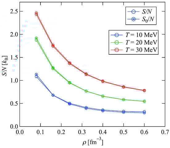 Figure 7 shows the approximate entropy per neutron of PNM as a function of the neutron number density . The behavior of was reasonable; it increased with the temperature T and decreased with increasing values. The entropy per neutron , derived from the free energy per neutron , is also shown in this figure. Here, is given by
