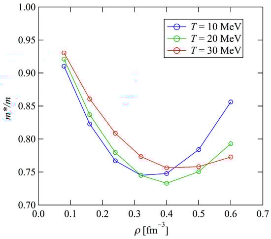Neutron effective masses normalized by the bare neutron mass as a function of the neutron number density . The blue, green, and red lines represent the results at 10, 20, and 30 MeV, respectively.
