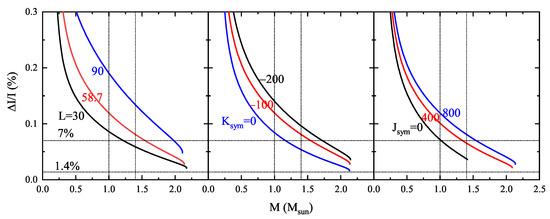 A similar trend is observed for and . However, an increase in leads to a decrease in . This is due to the fact that a higher results in a lower crust–core transition density, particularly affecting the transition pressure. On the other hand, an increase in L or raises the crust–core transition density, as shown in Figure 3 of ref. [42]. It is important to note that, since the symmetry energy at saturation density is well constrained, the effects of are not significant and are thus not depicted here. Consequently, the competition among the symmetry energy parameters ultimately determines the value of and its mass dependence.