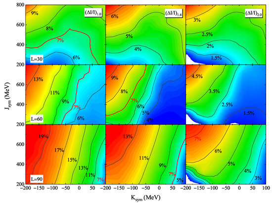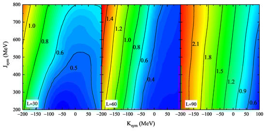 For a canonical NS with M⊙, the contours of the crustal fraction of NS moment of inertia in the versus plane, with (upper plot), 60 (middle plot), and 90 MeV (lower plot), respectively, are presented in the middle plots of Figure 3. When compared to the left plots of Figure 3, similar features can be observed. However, the parameter plane is clearly more tightly constrained for any value of L as the crustal fraction of the NS moment of inertia decreases with increasing mass. With MeV, no parameter combinations can satisfy the constraint , indicating that this constraint favors a symmetry energy with a larger slope L. For instance, at MeV, we obtain tighter constraints on and compared to a neutron star with M⊙. The lower limit of is constrained to be 289 MeV, while the upper limit of is constrained to be MeV. This constrained value of is consistent with findings of previous studies that suggest MeV [22,40,58,59,60]. These constraints on and may indicate a relatively stiff symmetry energy at high densities. For MeV, the lower-right corner of the plane is excluded. However, if the upper limit of is set to 0, the crustal fraction of the NS moment of inertia still cannot effectively constrain the symmetry energy.