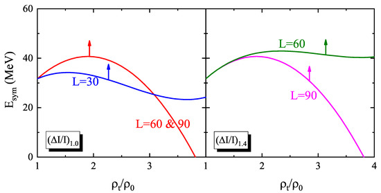 Since no combination of parameters can satisfy for neutron stars with 1.4 M⊙ at MeV, only the lines for MeV and 90 MeV are plotted in the right plot of Figure 5. Focusing on the blue and green lines, it is clear that the symmetry energy remains nearly constant with increasing density, even for densities . It is worth noting that the symmetry energy can only be constrained for approximately based on the current observations of NSs by NICER [14,15] and LIGO and Virgo [19] Collaborations, as discussed in our previous study [45]. The present results suggest that the crustal fraction of the NS moment of inertia has the potential to constrain the lower limit of the symmetry energy at densities exceeding , particularly when L is constrained to values less than 60 MeV.
