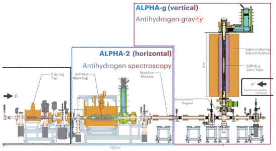 As summarized in Figure 1, two measurement sectors are present: a horizontal one primarily dedicated to optical spectroscopy measurements (ALPHA-2 in its present status), and a vertical one primarily devoted to gravitational and hyperfine spectroscopy measurements (ALPHA-g). A cross section of the ALPHA-g apparatus, showing the trap system, the magnets, the cryogenics and the detectors, is shown in greater detail in Figure 2.