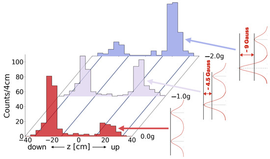 The measurement of gravity on antihydrogen was obtained from the fast ramp, for which all the biases data, listed above, were collected. All the details are reported in [13]. To illustrate the physical meaning of the results here, below, the raw event z-distributions for the slow ramp release are shown in Figure 3 along with a schematic representation of the vertical B field in the region of the trapped antihydrogen. Qualitatively, the experimental data in Figure 3 exhibit the behaviour characteristic of gravitational attraction between antihydrogen and the Earth. At a bias of about 0 g, the anti-atoms exit predominantly at the bottom of the trap, while at a bias of −2.0 g the antihydrogen atoms escape mainly from the top. The balance point is close to −1 g, as naively expected from the simplified one-dimensional argument in which a B-field difference of about 4.5 G between mirror G and mirror A, along the centre of the trap, is able to compensate the effect of gravity. On the other hand, to extract the value of the acceleration of gravity from such distributions is not an easy task. The B field is not perfectly uniform in the trap, since it changes when moving, both axially and radially, from the trap centre. In other words, when travelling inside the trap well, antihydrogen atoms experience different B fields (different magnetic forces), while experiencing the same gravitational force. To extract the value of the gravitational acceleration, a detailed and complex simulation of the ALPHA magnetic trap and of the antihydrogen dynamics was needed. The simulations have been produced for various hypothetical values of acceleration of gravity of antihydrogen (between −1 g and + 1 g). A comparison of the data with the simulation allowed for the measurement of the gravitational acceleration of the antihydrogen. Considering g = m/s2, it resulted in a value equal to (statistical + systematic) ± 0.16 (simulation)) g. The value was extracted choosing the “best fit” between simulations and data. The statistical uncertainty and the systematic uncertainty were summed in quadrature (with the statistical uncertainty, due to counting statistics, being 0.06 g). The main source of systematic uncertainty was connected to the detector efficiency difference in measuring antihydrogen exiting from the bottom and from the top of the trap. The simulation uncertainty was an estimate of the potential impact of various unmeasured quantities, such as magnet winding misalignments, off-axis persistent magnetic fields, and uncertainty in the energy distributions (longitudinal and transverse) of the trapped antihydrogen atoms. More details about the error budget can be found in [13].