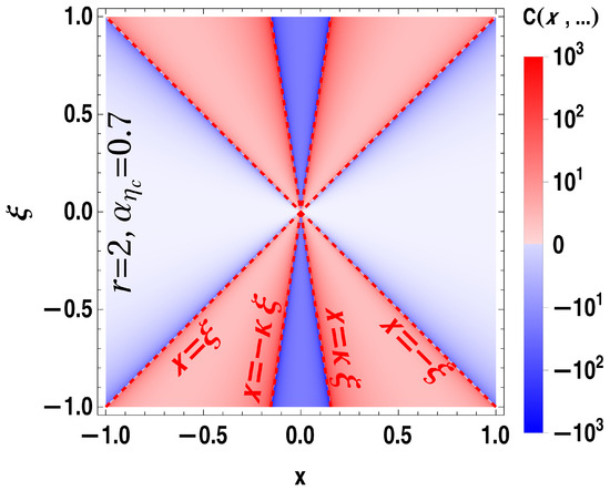 The density plot which illustrates the coefficient function (in relative units) as a function of variables . Color intensity encodes the absolute value of the coefficient function, whereas a hue (red or blue) encodes the sign. The red dashed lines effectively demonstrate the position of the poles in the coefficient function (29). The value of the slope parameter depends on kinematics and is defined in (30).