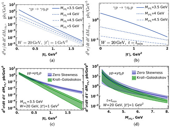 In order to estimate the sensitivity of the suggested process to the choice of the GPD, in the lower row of the Figure 3 we compare side-by-side predictions obtained with the Kroll-Goloskokov parametrization [36,37] and the so-called zero-skewness parametrization, which assumes that gluon GPD is a product of the forward gluon PDF and nucleon form factor. For each parametrization we have shown predictions as a colored band, whose width reflects uncertainty due to higher order next-to-leading (NLO) corrections which were not taken into account, and was estimated varying the renormalization scale in the range , as is usually done in the literature [2]. In the forward limit (small t) all the GPDs coincide with gluon PDF, so the sensitivity to the choice of the GPD parametrization is minimal. At larger values of t, the two parametrizations of the GPDs differ significantly, leading to a completely different predictions for the cross-sections.