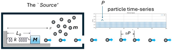 A Source contains a macroscopic oscillator of resonance frequency that releases elementary particles of mass m with the same velocity v every resonance period . M is the oscillating mass, and is the equilibrium position.