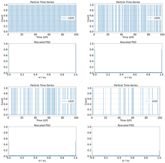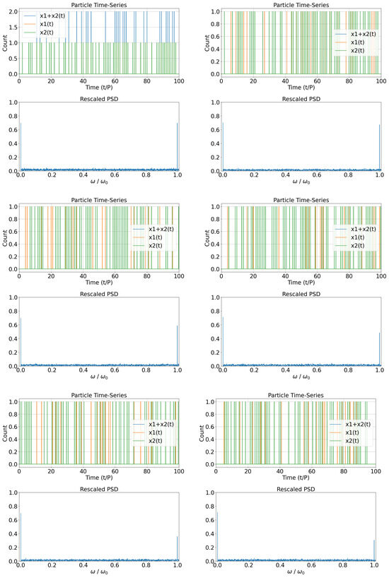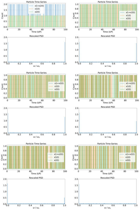 Top–bottom rows of panels: The superposition of two equal-power time series of particles emitted intermittently by the Source with fixed period P and a time delay between them equal to times the period P (plus an integer multiple of P) from top left to bottom right respectively. These time series of particles are collected by the Resonant Oscillator/Detector. The corresponding spectra are also shown. We see very clearly that when , the spectrum power at resonance vanishes.