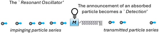 We have thus established that the Resonant Oscillator responds and announces the detection of (i.e., detects) a particle with a finite probability given by Equation (5) only if it consists part of a resonant time series. In particular if the stream of particles reaches a Resonant Oscillator with a frequency different from its resonance frequency, these particles will not be fully absorbed (i.e., detected). Some fraction of them will be absorbed, and some fraction of them will continue their motion unimpeded behind the Resonant Oscillator (see Figure 3). Obviously, the probability of detecting a particle in a general (not fully resonant) time series by a Resonant Oscillator is proportional to the probability of detecting one of them times the fraction of particles that are in a resonant time series. Mathematically, we express this as