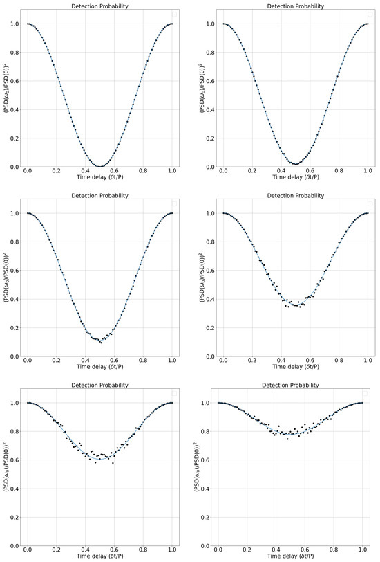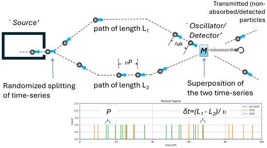 Let us assume that the Source emits random particle sequences (i.e., with particles emitted at random integer multiples of the resonance period P) that travel either through path 1 or through path 2 (Figure 4). Both particle time sequences reach a Resonant Oscillator at a certain position in which the particles going through path 2 have a certain time delay with respect to those going through path 1. Let us start with no time delay, or a time delay equal to an integer multiple of the period P. In that case, the Resonant Oscillator receives the time sequence and corresponding spectrum of the top left panel of Figure 5. For a time delay equal to of P plus an integer multiple of the period P, the Resonant Oscillator receives the time sequences and corresponding spectra of Figure 5. Finally, for a time delay equal to of P plus an integer multiple of the period P, the Resonant Oscillator receives the time sequence and corresponding spectrum of the bottom right panel of Figure 5. In that particular case, the power of the spectrum at the resonance frequency disappears! The reason is that, because of the superposition, the shortest periodic time interval between particles that reach the Resonant Oscillator is , not P as in the original time series, thus the fundamental frequency of the combined series is , not . In Figure 6 we repeated the calculations of Figure 5 for the superposition of two unequal time series of particles emitted intermittently by the Source, one with only 20% of the particles of the continuous time series, and another with only 50%. We clearly see that when , the spectrum power at resonance does not vanish because the two time series are of unequal strength, and therefore, they cannot cancel each other. In Figure 7, we performed multiple numerical experiments for multiple values of the time delay and plotted the probability of absorption of a particle in the combined time series according Equation (6). This is the distribution of the square of the ratio of the combined stream’s PSD at resonance over the PSD of the combined stream at zero frequency (the total power of the combined stream) as a function of the time delay . We also plot the function obtained from Equation (7) below for . The fit to the numerical experiments is perfect, except around where the PSD at resonance reaches the noise level.