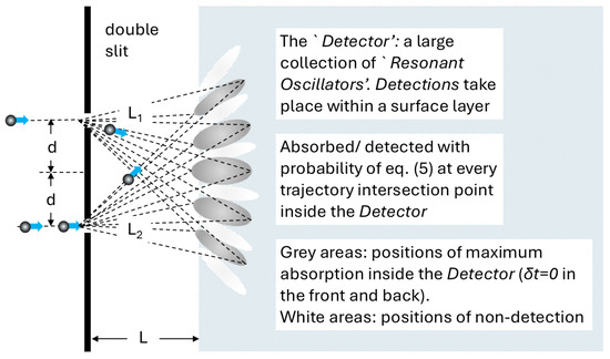 According to our previous definition, a macroscopic Detector consists of a large (infinite) collection of Resonant Oscillators. It is important that the Detector has sufficient thickness to absorb (and thus also detect) all particles from the combined time series that reach it. The interference setup that we propose is that from a typical double-slit experiment. Particle series reach points of the Detector coming from both slits, and the time difference between the two time series is proportional to the difference in the particle trajectory lengths over the particle speed. Particles are absorbed by the Resonant Oscillators/Detectors at each layer of the Detector according to the probability distribution of Equation (7). The particles that are not absorbed continue to travel along the same line that they followed after emerging from their respective slit and are combined with the stream of non-absorbed particles that emerged from the other slit. Some of them will be absorbed/detected in that second layer of the Detector and so on and so forth. Eventually, all particles emerging from both slits will be absorbed, and the interference pattern shown schematically in Figure 8 will emerge in the interior of the Detector. No particle will be left undetected. What is important though is that a certain finite thickness is needed in order for the Detector to absorb/detect all particles.