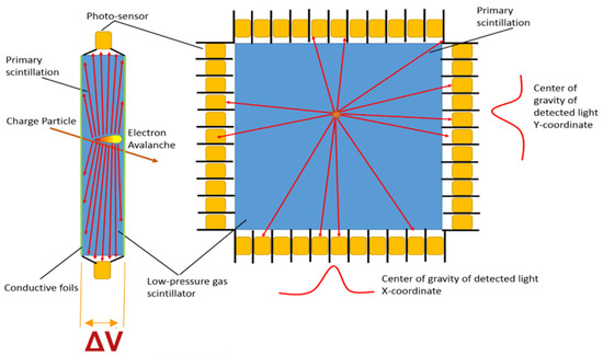 When an ionizing particle crosses the active volume, it releases a small amount of energy in the form of ionization electrons, which are multiplied in the gas by a uniform electric field established between the two metalized parallel plates. The scintillation light emitted during the avalanche process, known as secondary scintillation or electroluminescence, is reflected back and forth by the two metallized electrode foils and guided to be recorded by the arrays of collimated photo-sensors (see Figure 1). The collimation is crucial for the precise localization of the impinging particles, as it narrows down the detected photon distributions, so its peak is more heavily weighted near the position of the avalanche.