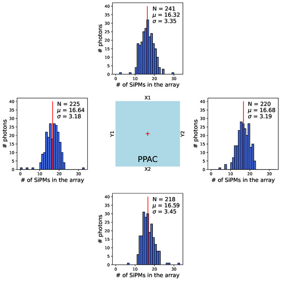 Illustration of the reconstruction process for a simulated event induced by a 5.5 MeV alpha particle at the center of the parallel plates. The photon counts registered by each photosensor are used to generate four distributions, one for each wall. The resulting plots provide the statistical information required for reconstruction, with the mean of each distribution highlighted in red. The particle’s position along each axis is determined by analyzing the signals from opposing walls.