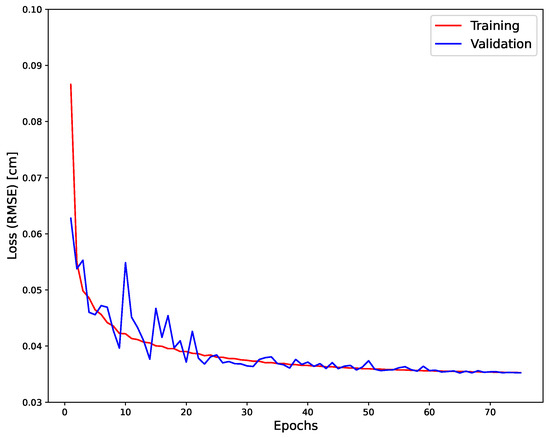 Additionally, the learning curve for the final model is illustrated in Figure 3. As can be seen, the validation loss curve exhibits an erratic behavior during the first 20 epochs, but it stabilizes afterwards, with the training loss value closely matching the validation loss, which suggests a low level of overfitting.