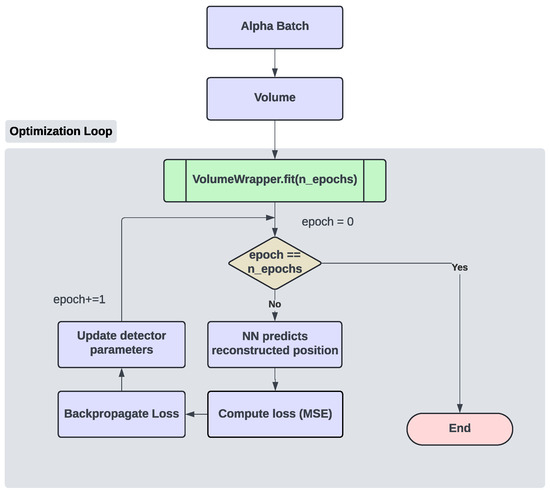 The Volume class includes a Wrapper that contains the fit method, responsible for optimizing the detector by determining the optimal configuration based on the NN reconstruction model. This optimization is conducted within a loop designed to iteratively identify the best detector configuration. The structure of this loop is illustrated in Figure 4.