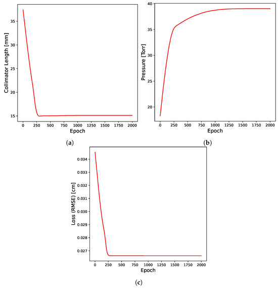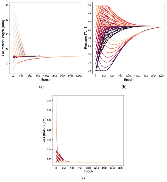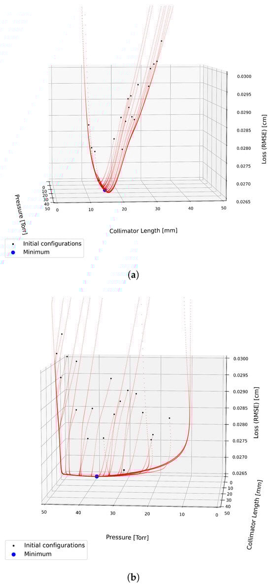 As shown in Figure 7, all configurations converge to the same optimal values for pressure and collimator length, indicating that this minimum of the loss function is the absolute minimum within the studied range.
