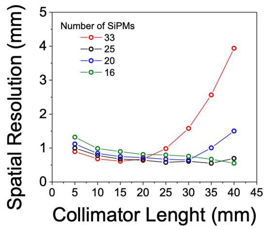 Position resolution as function of the collimator length, for SiPMs arrays of different granularity—the number of photo-sensor per array ranges from 12 to 33 elements. The pressure was fixed to 30 Torr. Image from Reference [19].