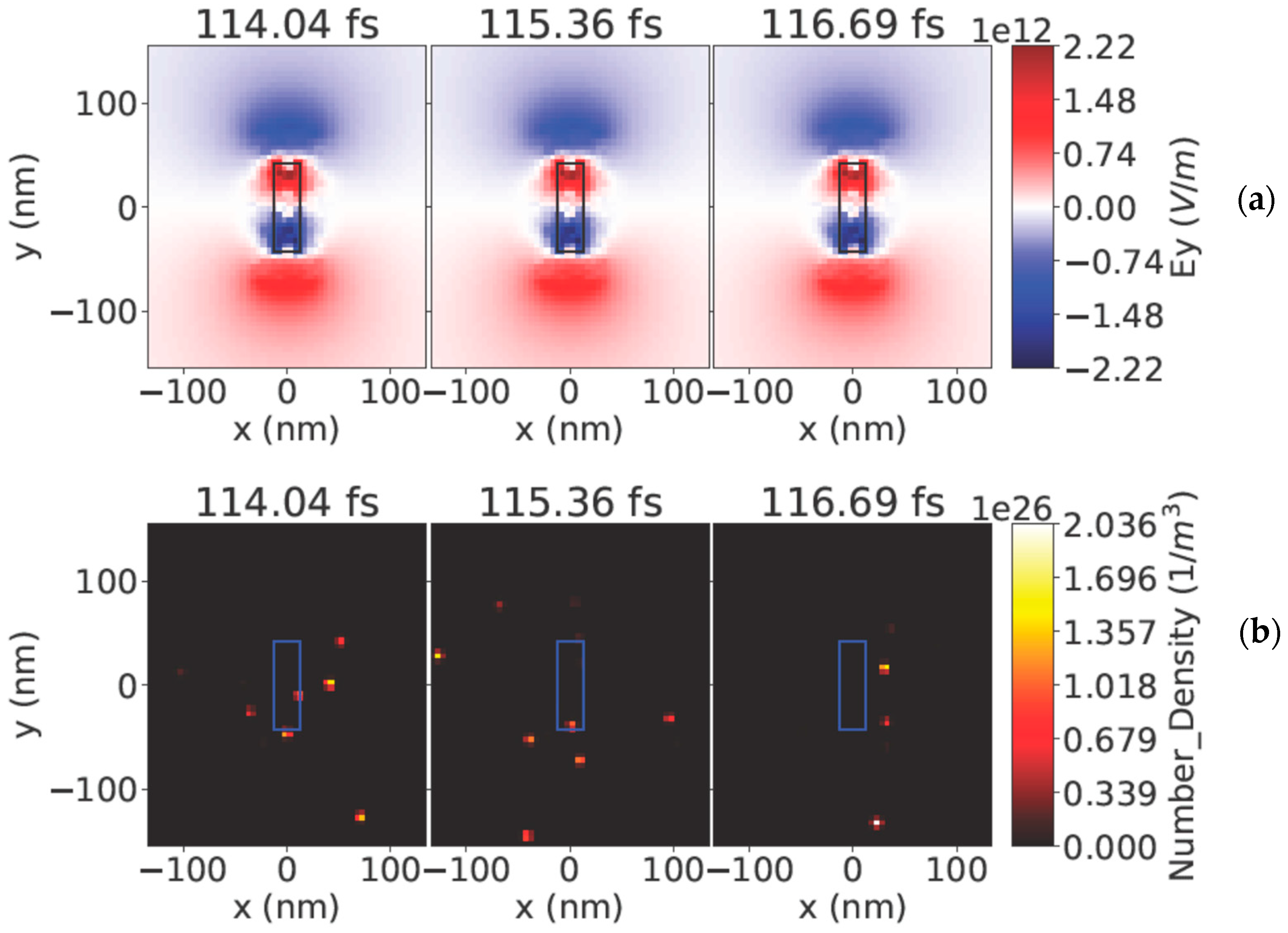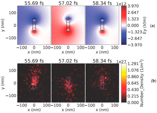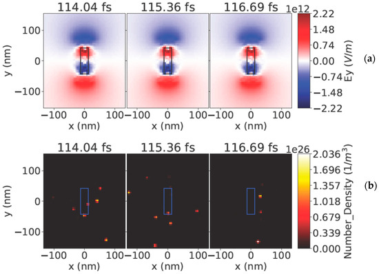 In what follows, we analyzed the electric field around nanoantennas. In Figure 2, the electric field around a crossed nanoantenna is shown at about the half-time of the laser pulse of 4 × 1017 W/cm2, whose duration was 120 fs. The field around the nanoantenna at the half-time of the pulse (see Figure 2a) is stronger than that at the end of the pulse in Figure 3a. This behavior is different from that of the radiation pulse of the low intensity 4 × 1015 W/cm2, where the field around the antenna continuously increased towards the end of the pulse as explored in [28]. The electron density also decreases towards the end of the pulse (see Figure 2b and Figure 3b). In Figure 2, Figure 3 and Figure 4, a view is given from the side in direction Z, so the crossed antenna is seen as a vertical rod from the side (refer to Figure 1 for clarity on the presented view).