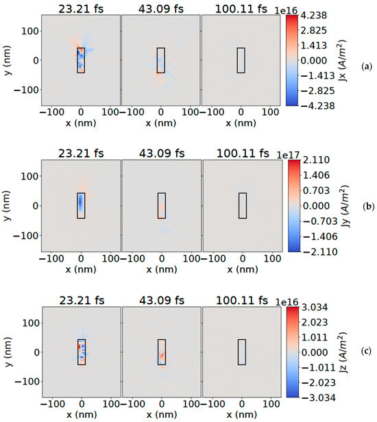 The laser pulse of the 4 × 1017 W/cm2 intensity generates a strong electric current; it spreads out from the resonating nanoantenna due to the kick out of conducting electrons from gold and the ionization of hydrogen matter to proton–electron pairs at the beginning of the pulse; examples for the current at 23 fs, 43 fs, and 100 fs are shown in Figure 4a–c, for the X-,Y-, and Z-components respectively. The current then decreases towards the end of the pulse (see Figure 4 for 100 fs) and nearly vanishes because most of the conducting electrons are kicked out of the gold after ≈100 fs. For the vertical dipole that is parallel the electric field E of the incident radiation wave, the current behaves similarly to that for a crossed antenna.