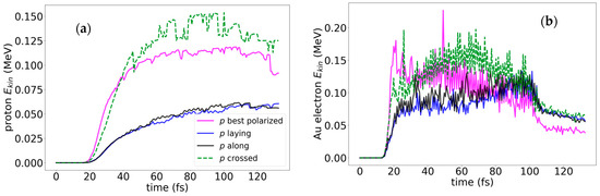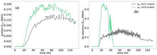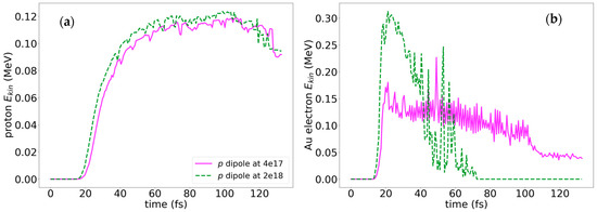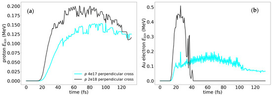 Eventually, we demonstrate that the cross antenna in the plane normal to the direction of the laser wave propagation (see Figure 1) is not sensitive to the polarization of the field E. In Figure 9, we present the evolution of the energies of protons (a) and gold electrons (b) around the crossed antenna in the diagonally polarized laser fields of 4 × 1017 W/cm2 and 2 × 1018 W/cm2 intensities. Upon comparison of the respective plots in Figure 8 vs. Figure 9, we see that the maximum energies of protons in the diagonally or vertically polarized radiation fields are the same, ≈0.15 MeV for 4 × 1017 W/cm2 and ≈0.2 MeV for 2 × 1018 W/cm2. The energies of electrons kicked out of the gold do not depend on the polarization of the incident radiation; the time domain for the gold electrons and their energies are also the same for vertically and diagonally polarized radiation: ≈105 fs (compare Figure 8b vs. Figure 9b).