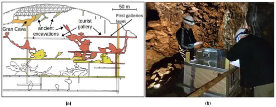 (a) The section of the Temperino mine where several levels are visible. At the first level (enclosed by a blue dotted line), there is the tourist path where the muographic measurements were carried out. (b) A photograph of the detector installation in the area with the highest concentration of Radon gas.