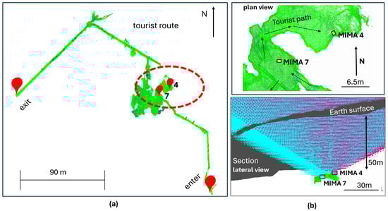The measurements 4 and 7 were performed in the area of the greatest presence of Radon gas, which is the subject of this article (Figure 1b). The numbering follows the chronological order of the measurements. The area of interest is located approximately halfway along the tourist route near the area called “pillar chamber”where the measurements 4 and 7 were taken (Figure 2a).