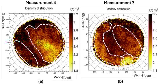 The two maps are represented in angular coordinates and the center corresponds to the vertical direction. Comparing the density values obtained with the density of the rocks present in the Temperino mine (described in Section 2.3), which are in the range 2.4–5.2 , some areas of lower density can be identified in both maps (surrounded by a white dotted line). These angular regions have been identified as low-density anomalies attributable to hidden cavities that are located above the tourist route.