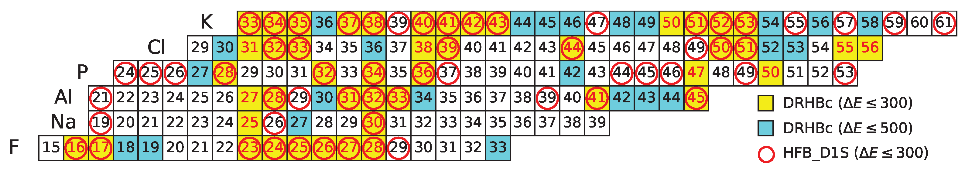 - Zhang, K.; Cheoun, M.K.; Choi, Y.B.; Chong, P.S.; Dong, J.; Geng, L.; Ha, E.; He, X.; Heo, C.; Ho, M.C.; et al. Deformed relativistic Hartree-Bogoliubov theory in continuum with a point-coupling functional: Examples of even-even Nd isotopes. Phys. Rev. C 2020, 102, 024314. [Google Scholar] [CrossRef]