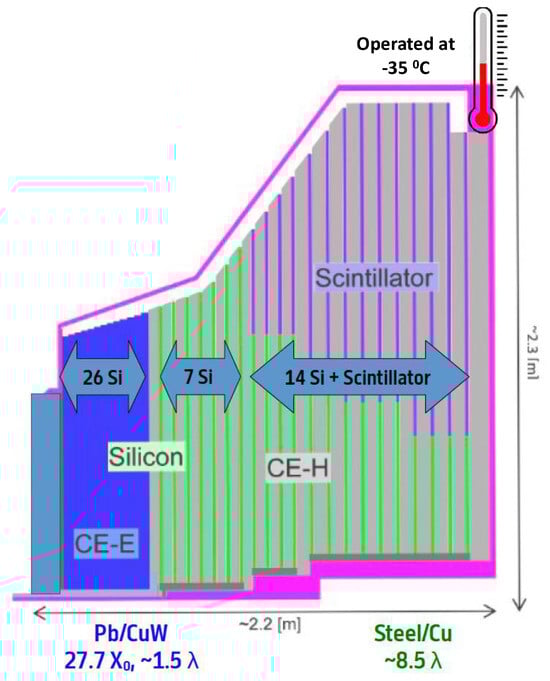 HGCAL is a high-precision sampling calorimeter composed of silicon and scintillator modules, arranged across 47 active layers with over 6 million channels. In the electromagnetic section, the silicon modules are interleaved with copper, copper–tungsten, and lead absorbers. The silicon sensors are segmented into hexagonal cells, with a cell size of 0.5 cm2 in the innermost region and 1.2 cm2 in the outer regions. The hadronic section features silicon sensors in high-radiation areas, while plastic scintillator tiles are used in regions of lower radiation. The hadronic calorimeter is equipped with steel absorbers. To minimize leakage currents in the silicon sensors and SiPMs, the entire calorimeter is maintained at −35 °C. This highly segmented design enables detailed measurements of both the transverse and longitudinal shower profiles, as well as precise timing information, aiding in pile-up mitigation and enhancing the event reconstruction performance. A schematic representation of HGCAL design in the longitudinal cross section in the upper half of one endcap is shown in Figure 1.