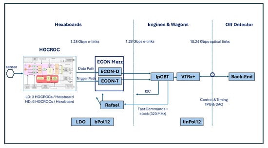 The PCB layouts for the FE electronics were optimized for the board shapes and the number of optical links, as required by the data rates. For high-density silicon modules, the ECONs are mounted directly on one PCB, the Wagon board, while the lpGBTs and VTRx+ are located on a different PCB, the Engine board. In contrast, for silicon low-density modules, ECONs are mounted on mezzanine boards, separate from the Wagon board. For scintillator modules, the ECONs, lpGBT, and VTRx+ components are all mounted on the same motherboard. The Wagon boards are connected to the Engine boards with miniature connectors [16,17]. The lpGBTs use the forward error correction (FEC5) protocol [18] for the data path. The total average data volume for the whole HGCAL is around 2.5 MByte per event, which scales approximately linearly with the average pileup. At an L1A rate of 750 kHz, this corresponds to an average data rate from the FE electronics of 15 Tb/s. For the trigger path, the total average rate of trigger cell data will be 1.25 Mbit per bunch crossing, or 50 Tb/s. The total number of 10.24 Gb/s lpGBT links from FE electronics is about 10,000 for both DAQ, and TPG BE electronics. A schematic representation of the HGCAL FE readout, trigger, and control chain is shown in Figure 2.